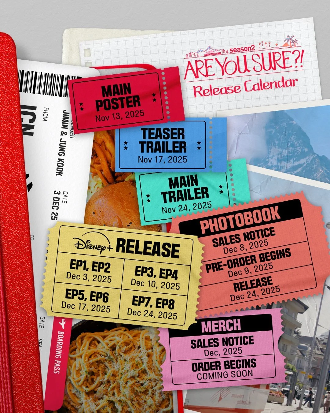 On November 4, 2025, HYBE announced season 2 of the travel show, ‘Are You Sure?!’, featuring Jimin and Jung Kook. The eight part series follows the two members as they explore several locations including Switzerland and Da Nang, Vietnam.